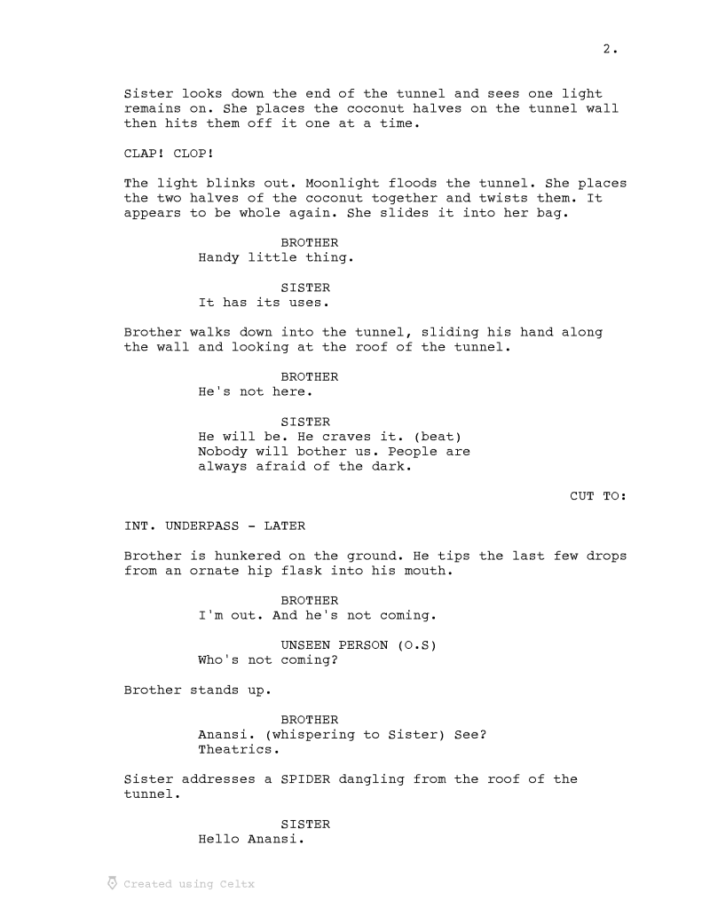 The Exchange is a six page script example that is heavily dialogue focused. While it could function as a standalone short film, it has been written with a video game intro or early story cut scene in mind.
